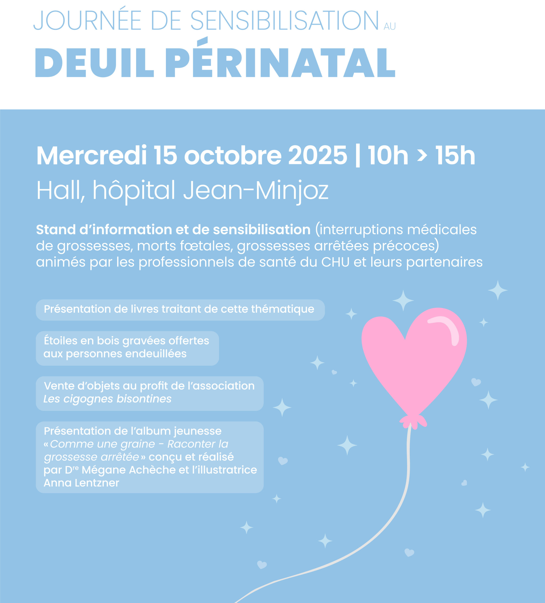 L'Interstice sera présent à travers ses livres, lors de la journée de sensibilisation du deuil périnatal, qui aura lieu le mercredi 15 octobre, de 10h à 15h, au CHRU Jean Minjoz. Un temps pour informer, accompagner et fournir des ressources aux personnes qui vivent ou ont vécu une période de deuil périnatal.